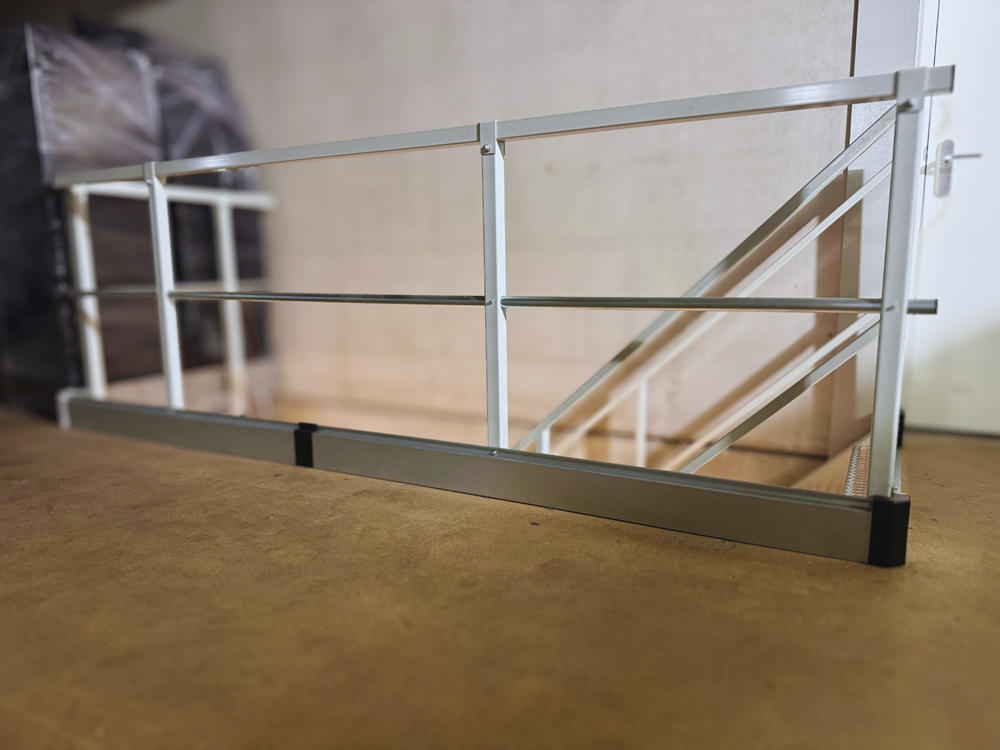 The toe board is part of a complete and safe balustrade construction, in combination with the knee rail and handrail. The knee rail, which is located above the toe board, is always placed at knee height. This prevents anyone from slipping under the balustrade. The handrail provides support and marks the safe boundary of the floor. The handrail and knee rail consist of round galvanized tubes with a diameter of 35 mm, which are connected at the corners with specially developed plastic connectors. This ensures a sturdy and reliable connection.